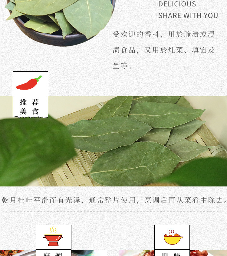 【Culinary Applications】Bulk dried bay leaves are an important spice for preparing soups and stews. Their unique sweet aroma adds layers of flavor to dishes. When making red-braised pork, braised foods