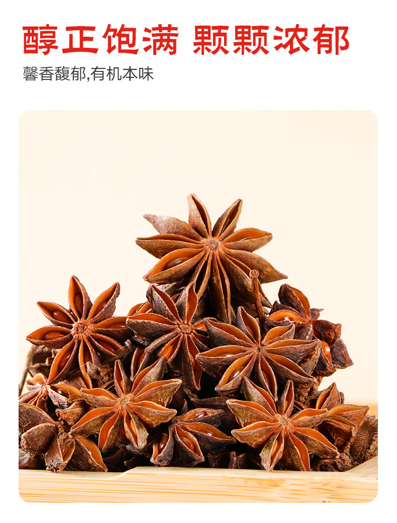 【Hot Pot Seasoning】Selected pouch organic star anise is an important spice for preparing hot pot bases, pairing perfectly with Sichuan peppercorns, cinnamon, and other spices to add rich aroma to hot pot. The 50g size is perfect for family gatherings, meeting daily hot pot preparation needs.