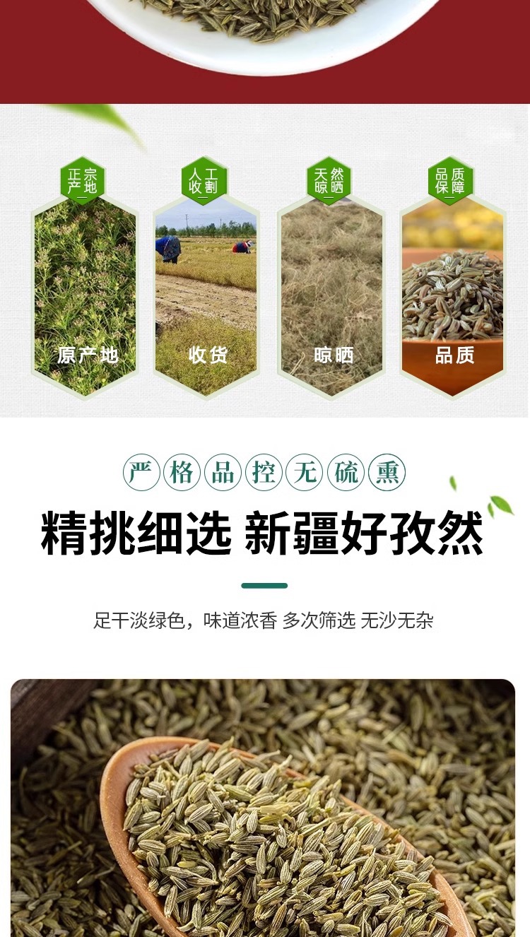 【Health Benefits】Cumin contains abundant volatile oils and various vitamins, with properties that warm the middle energizer, dispel cold, and regulate qi to relieve pain. In traditional Chinese medicine theory, cumin is widely used to treat symptoms like stomach cold abdominal pain and indigestion. Modern research indicates that cumin also has antioxidant, anti-inflammatory, and digestive-promoting properties. Moderate consumption helps boost immunity and improve gastrointestinal function.