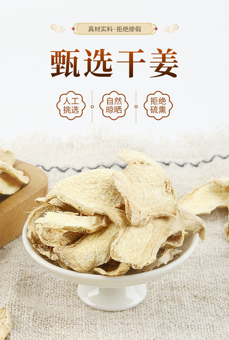 【Health Benefits】Dried ginger slices contain abundant volatile oils and gingerol and other active compounds, with properties that warm the middle energizer, restore yang, and warm the lungs to resolve