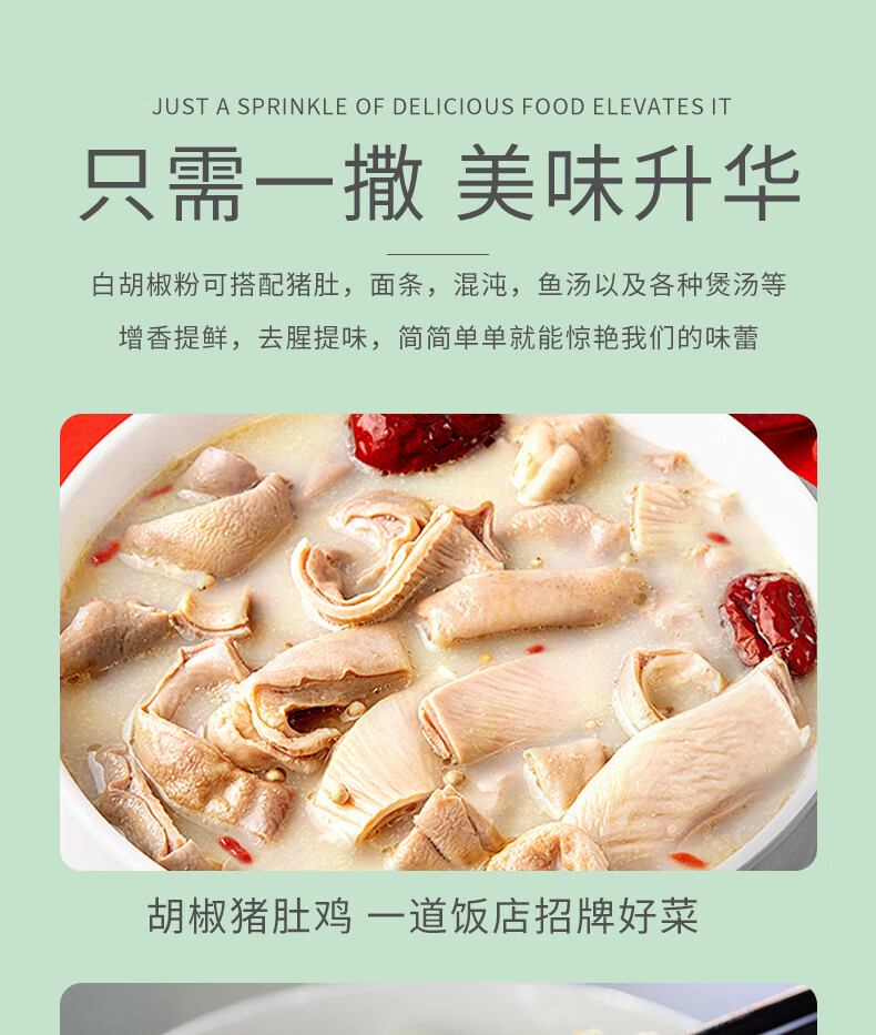 【Soup Expert】The 35g white pepper powder is an excellent companion for soup making, particularly suitable for preparing chicken soup, bone broth, and seafood soup. Its mild spiciness effectively remov